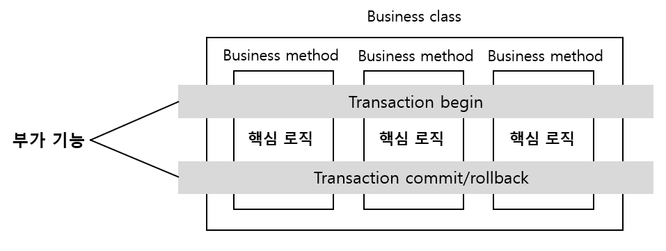 첫 번째 문제점을 해결하기 위해서는 부가 기능을 타깃으로부터 분리할 필요가 있다. 따라서 AOP를 활용해서 부가 기능을 별도의 모듈로 분리하는 방법을 생각해볼 수 있다.
